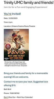 Beth Britt is hosting our next Family Fun day! We will be seeing the movie, "David" in theaters on December 20, 2025. If you are interested in attending please contact Beth directly! Thank You!